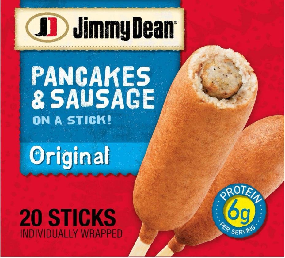 - Warm, flavorful sausage wrapped in a thick, fluffy pancake, held together with a single stick